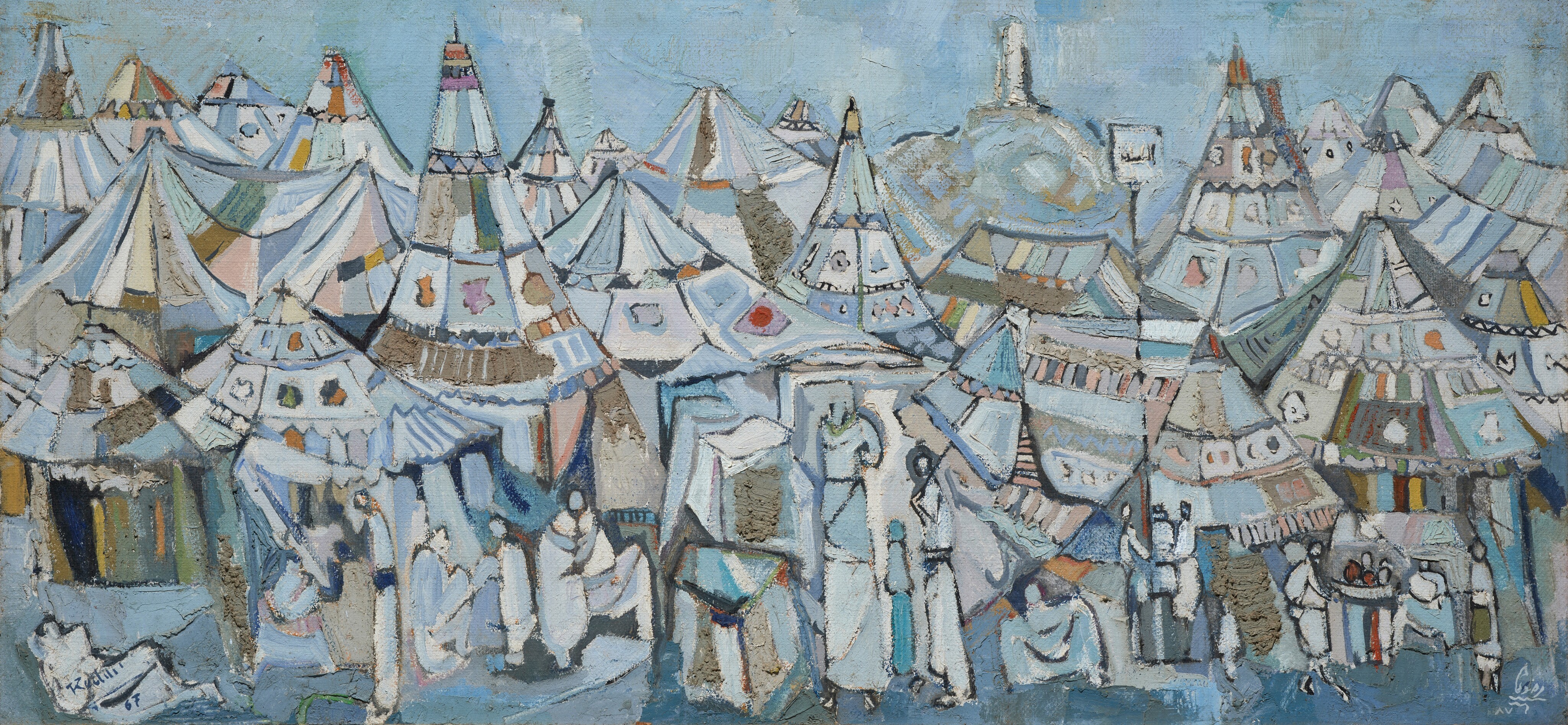Signed "Redwi" and dated "'67" (AD) in English (lower left); signed "Radwi" and dated "'87" (AH) in Arabic (lower right)