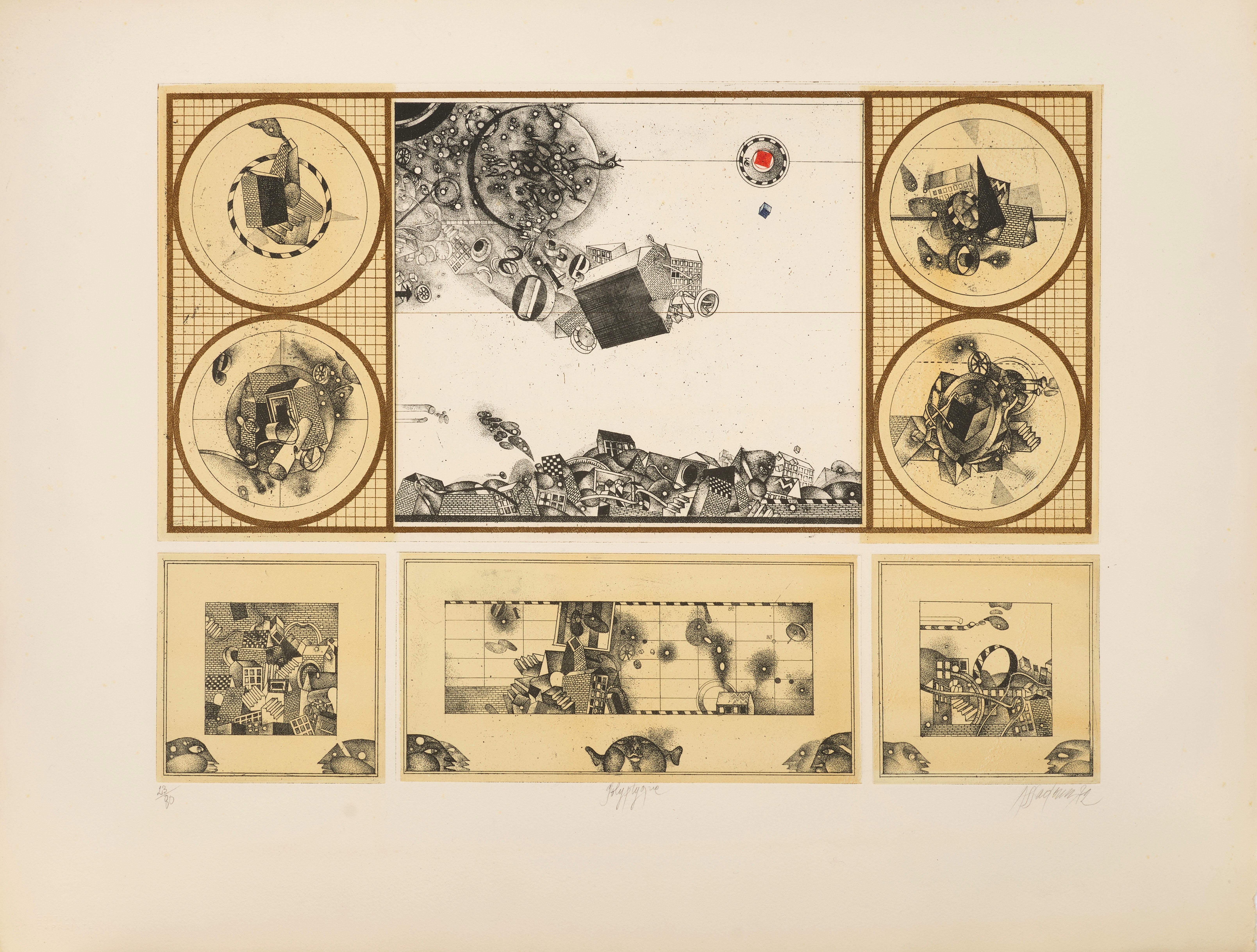Signed and dated "Assadour 1972" (lower right), numbered "23/80" (lower left), titled "Polyptyque" (lower center)
