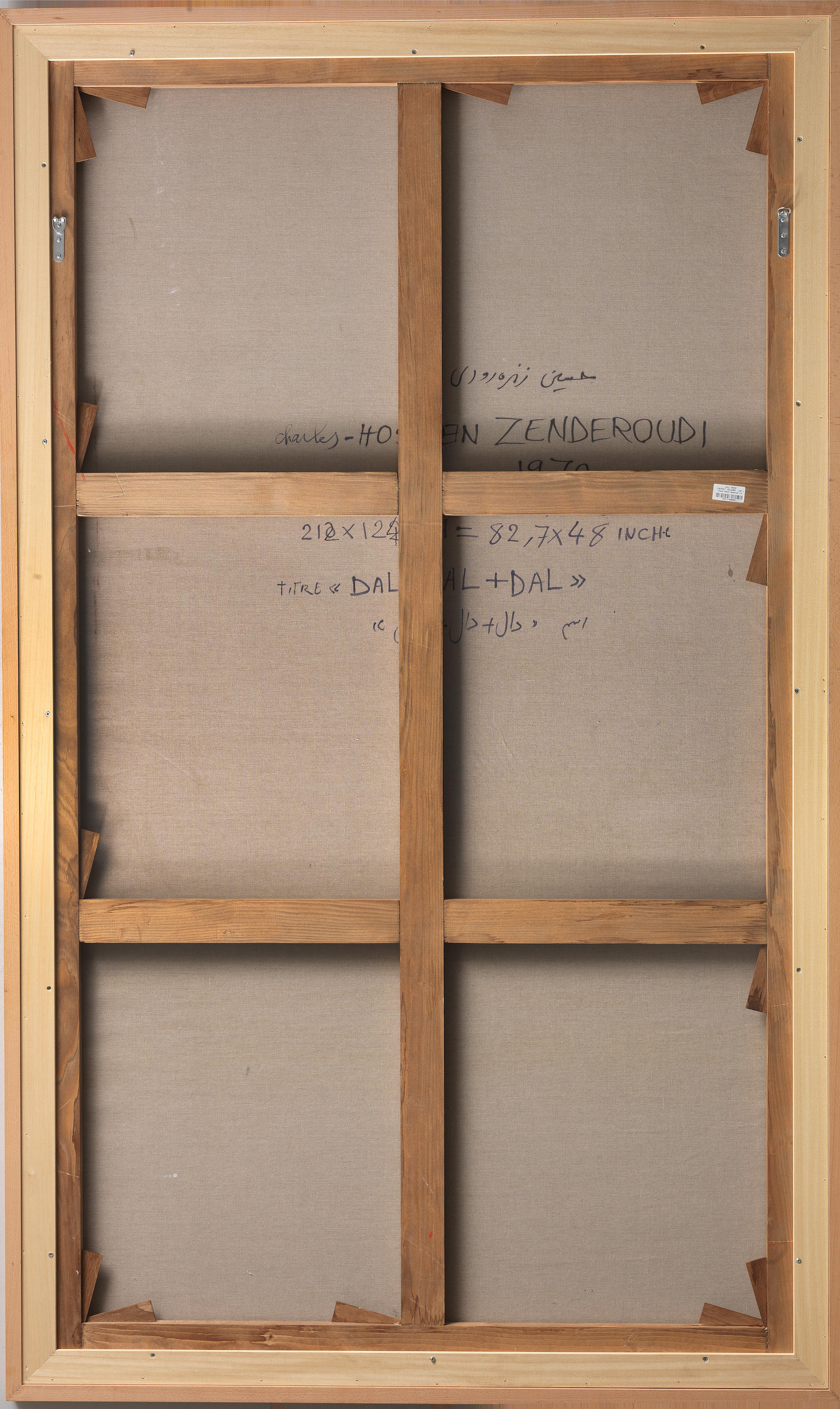 Measured but spontaneous, technical yet effuse, Zenderoudi' manipulates Persian calligraphy with effortless ease, boasting a visual scope which faithfully captures the salient elements of Iran's traditional popular religious aesthetic. Rendered with the use of rich and vibrant colours, his canvases replicate the tonal and textural qualities of the votive art so common to the Iranian urban landscape.