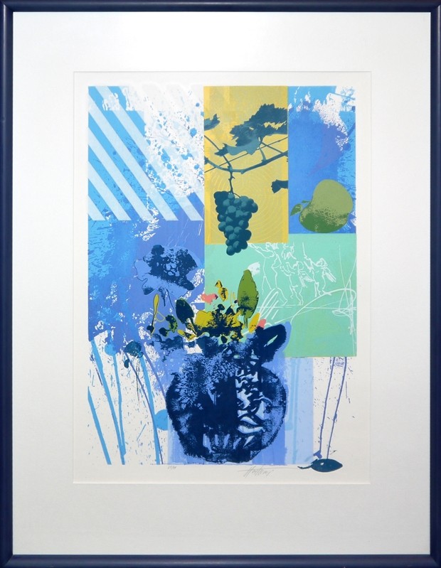 abstract compositions with vase and grapes in blue, color serigraph, 55 x 38 cm, signed, num. 27/99; Abstract composition with vase and grapes, color silkscreen, 58.5 x 40.5 cm, signed, num. 21/99; Torso and ancient symbols, color silkscreen, 58 x 40.5 cm, signed, num. 21/99 and St. Mark's Lion, color etching, 29 x 41 cm, signed, dated (19) 93, num. 17/90, all appealing under P.p. and glass framed
