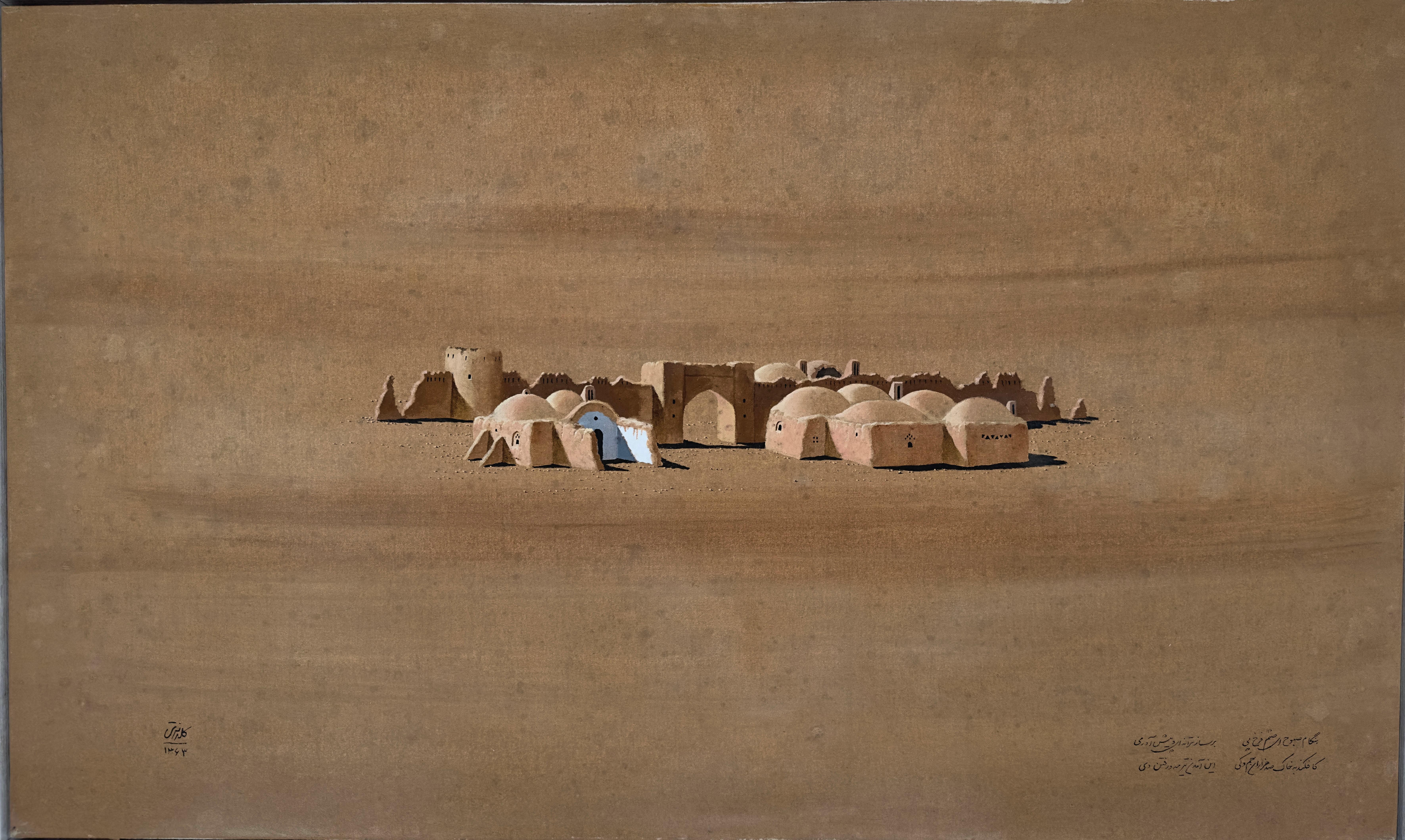 Signed and dated in Persian "Parviz Kalantari 1362" (lower right), annotated with a verse of poetry
