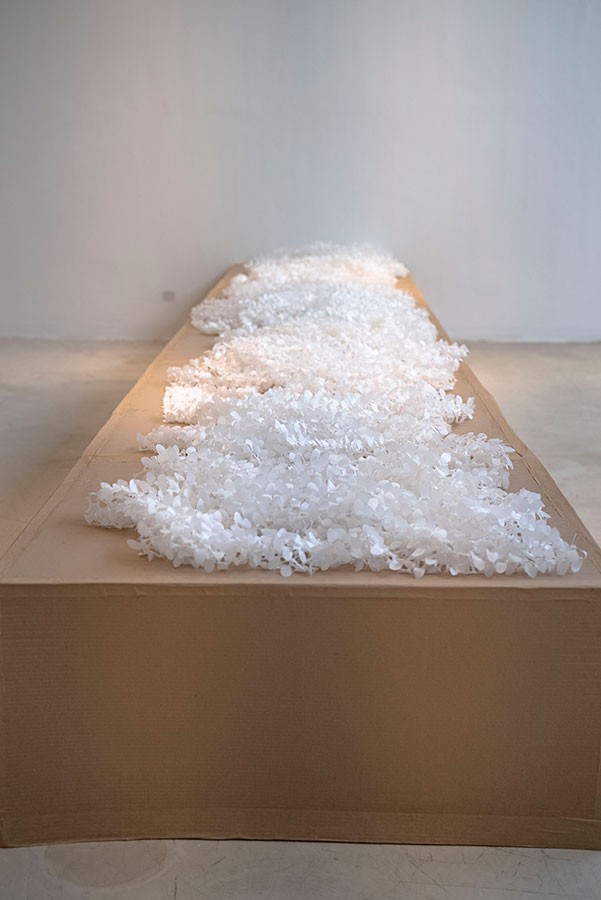 Cutting out and collage of parchment paper with surgical blade and cardboard box