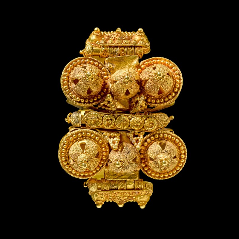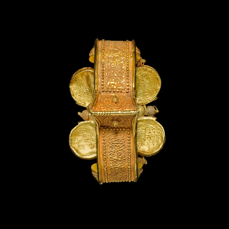 This exceptional bracelet is a rare example of Seljuq jewellery. The cast discs on the reverse are Persian, made during the reign Alp Arslan, Great Seljuq (r.1063-72), allowing us to date the piece with some accuracy. It can be compared to an armlet in the Metropolitan Museum of Art in New York, and another in the Freer Gallery of Art in Washington D.C., both dated to the eleventh century.