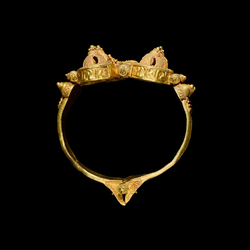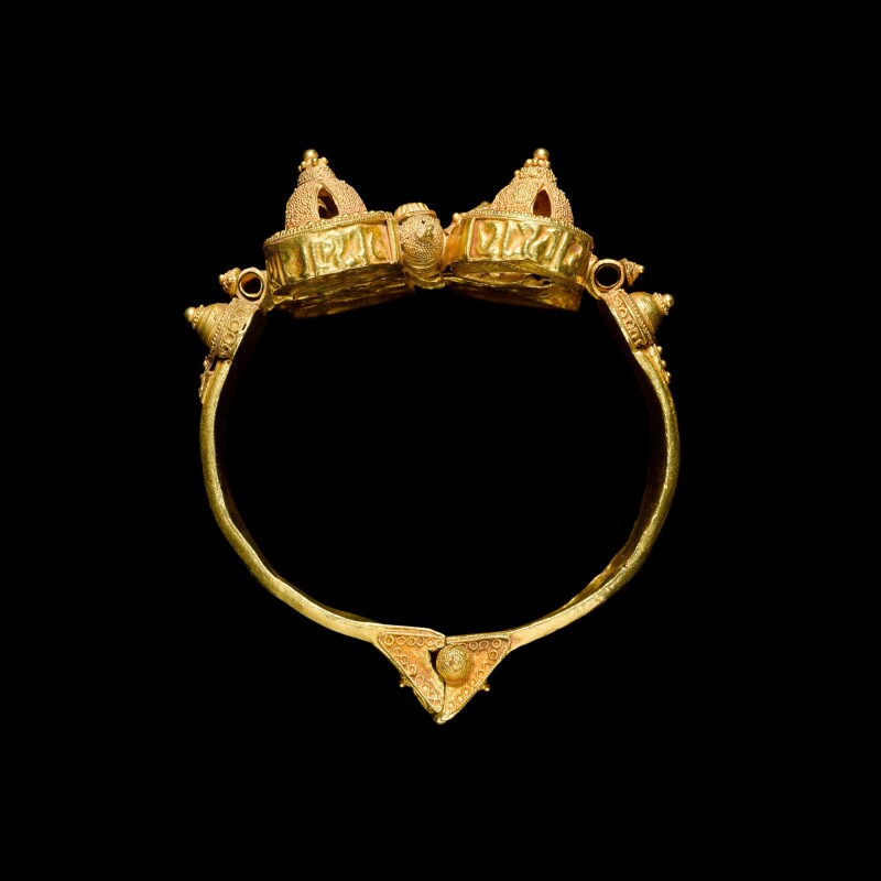 Both the pieces in the American institutions have a body consisting of a rounded and twisted armband, which derives from Greek models and was common in the Mediterranean (see, for example, a bracelet with a twisted hoop attributed to eleventh century Syria, now in the Freer Gallery of Art, inv. no.48.25). The piece to hand, however, has a wide flat hoop decorated with granulation forming waves and circles.