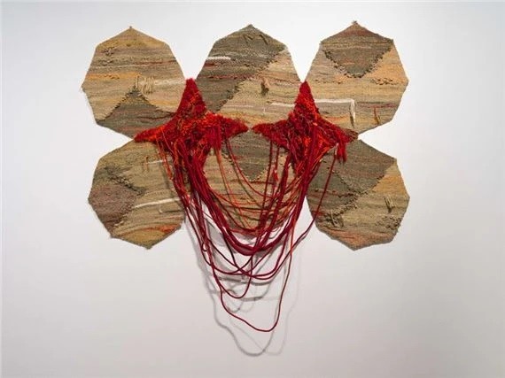 Boroufar’s weaves are uncanny. They remind us of elements of the built environment via a correspondence that is subtle, ambiguous, pleasing. Gaze at two tall and skinny structures she has woven long enough and you may see a pair of wind towers, known as bad-gir, a form of vernacular architecture for cooling structures in the desert. Elsewhere, a clump of hexagons—also woven—begins to evoke the delicate tile work one might find in the great mosques of Esfahan. Another work takes inspiration from gaalipoush, the ancient practice of covering roofs with leaves in the northern Caspian Sea region—an architectural gesture but also a psychic one: nature in the service of healing, protecting.