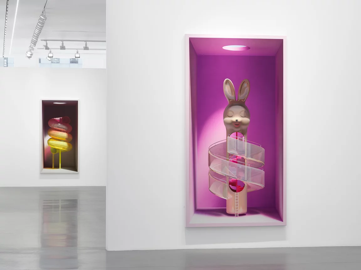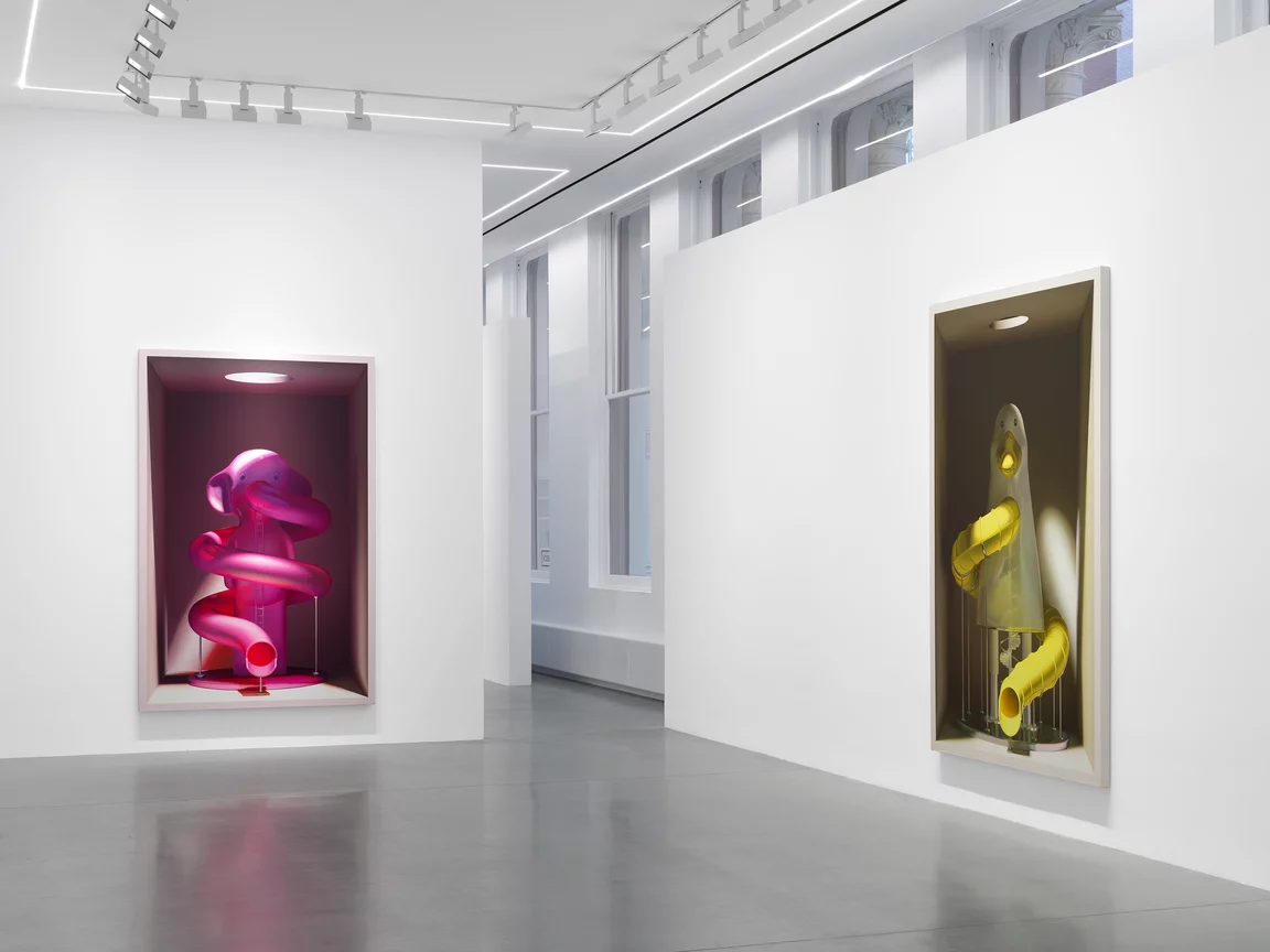 Mehdi Ghadyanloo uses the trompe l’œil technique of his murals to compose his recent paintings, and they take on the shape of square boxes with dream-like imagery and hyperrealistic technique. Their architectural appearance reflects the artist’s investigation into designing and representing space on the canvas, evoking the visual and metaphysical constructions of Giorgio de Chirico. Ghadyanloo’s meticulous technique reminds us that in his youth he painted Persian miniatures in Iran. Each of his painting-boxes reveals his bril-liant ability to trick our eyes and our perception of reality. On what we thought was a flat surface, there appears a fenced-in space or a maze of slides."