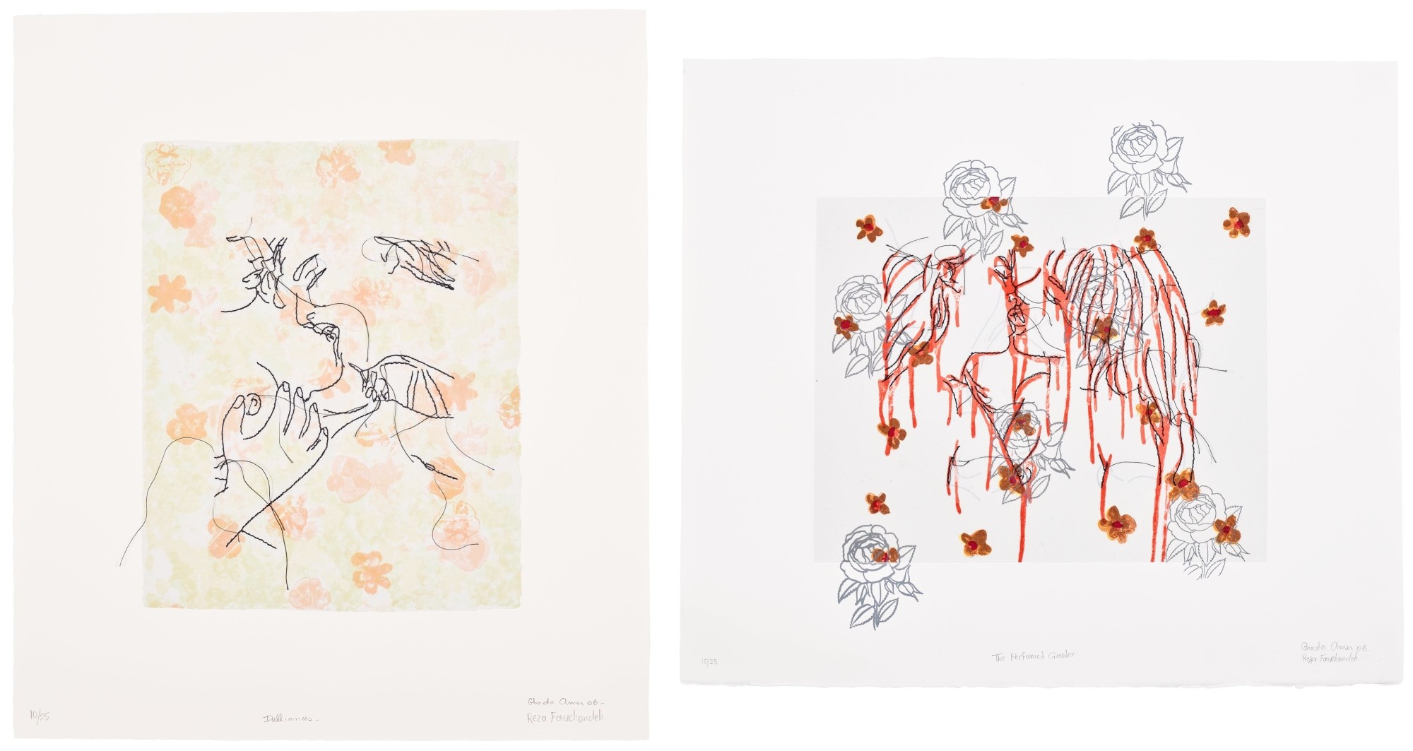 • دو لیتوگرافی رنگی با کلاژ پارچه و دوخت دیجیتالی، روی کاغذ بافته شده، با حاشیه کامل