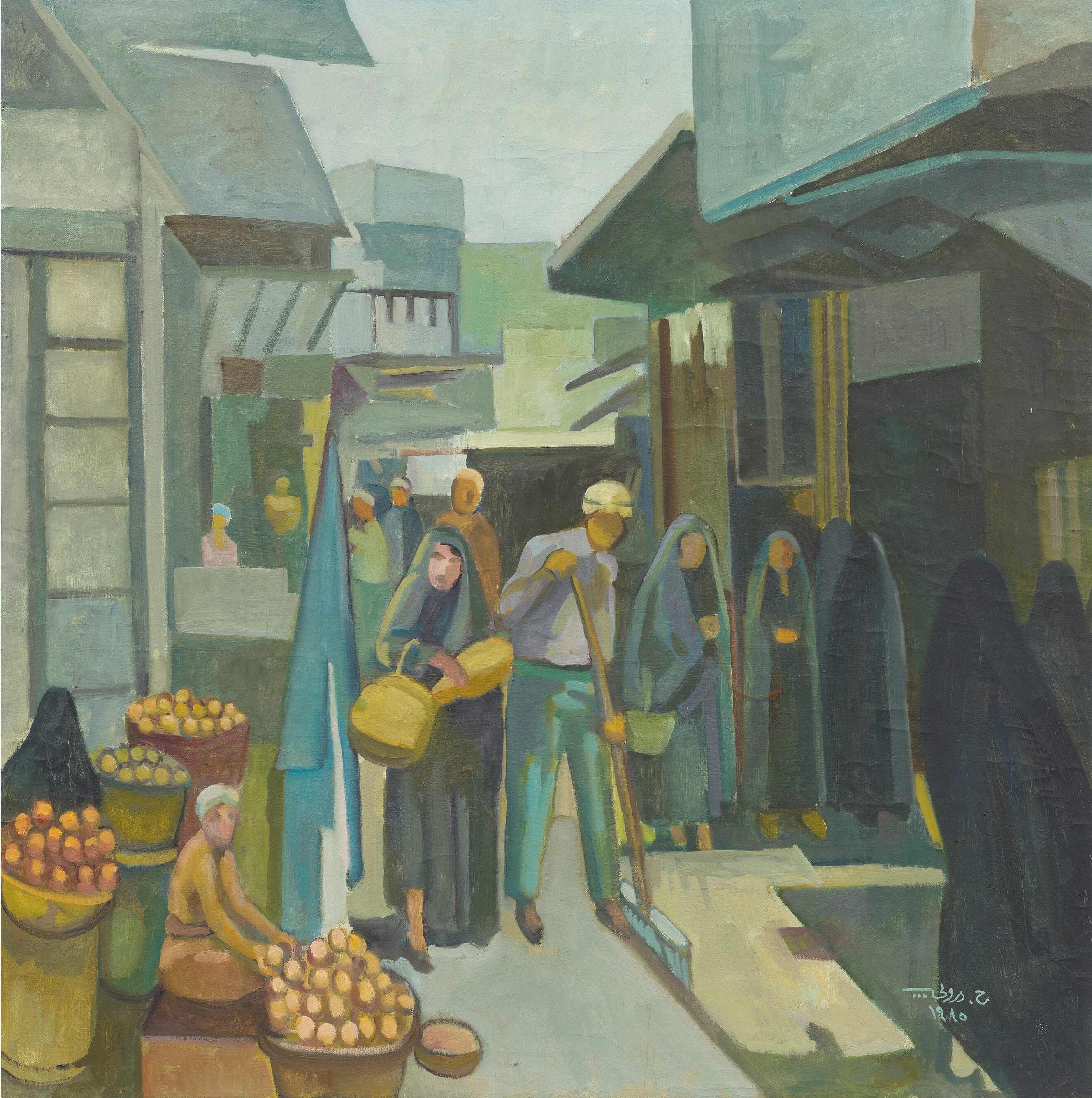 امضاشده «H.Drubi» و تاریخخورده «۱۹۸۵» به عربی (پایین راست)، امضاشده و عنوانخورده به عربی (پشت اثر)