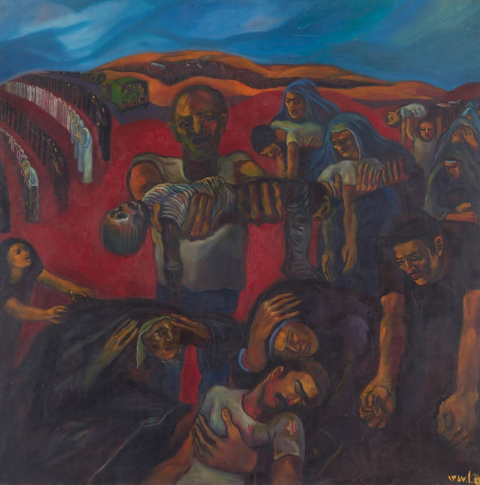 رنگگزینی الخاص در این اثر نیز با همه رویکردها و تأثرات بالا همخوانی دارد. رنگهای گرم قرمز و قهوهای و سیاه شمایلهای رنسانسی، نقاشهای مکزیکی و پردههای قهوهخانهای را به خاطر میآورد و التهاب فضا و رنج مردم را به خوبی نمایان میسازد. رنگ آبی چادرهای زنان نماد پاکدامنی آنان و آسمان آبی نشان از روزهایی روشن و امیدبخش دارند که در پی این روزهای خونین خواهد آمد.