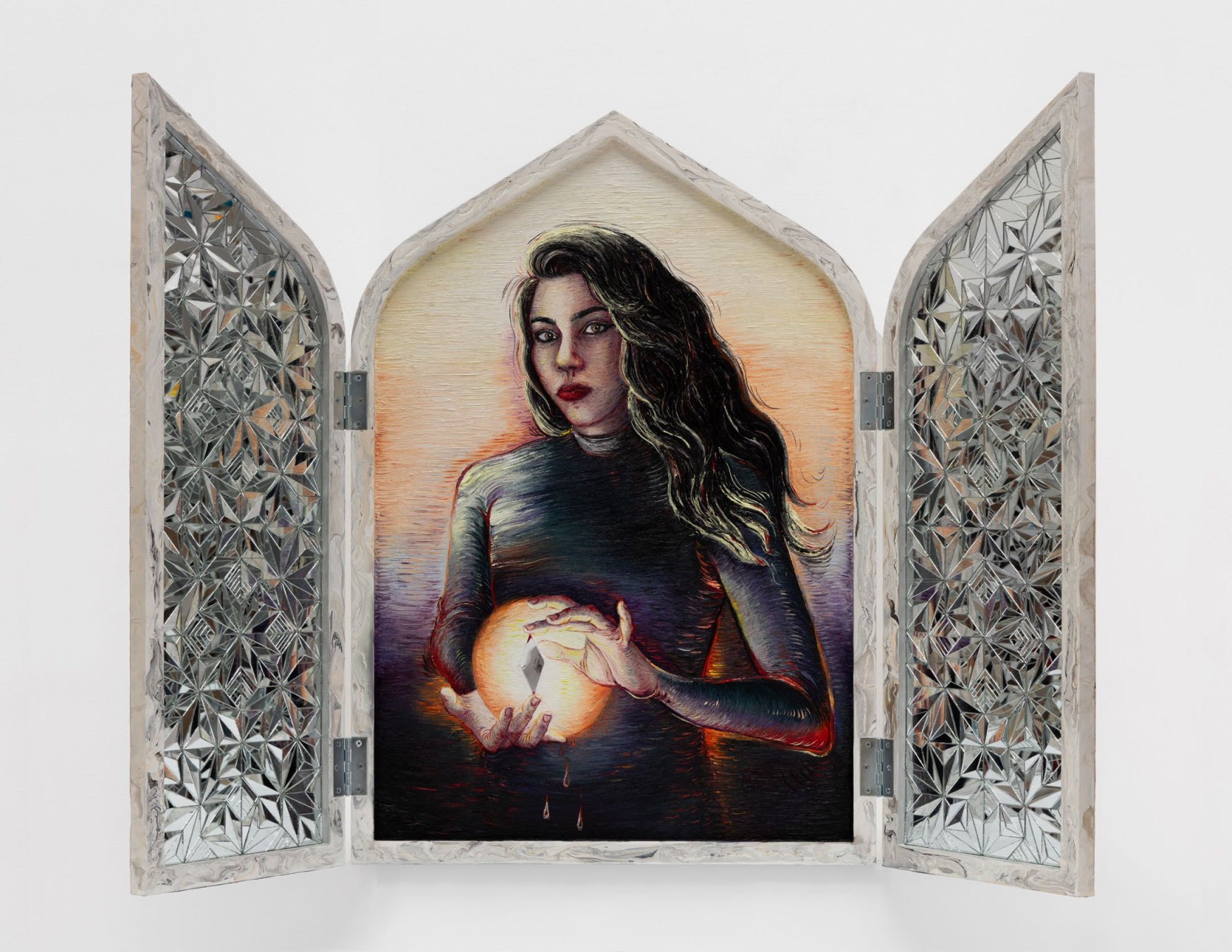 رنگ روغن، اکریلیک، آینه با برش دستی، گچ، چسب، لولا، میخ روی ام دی اف