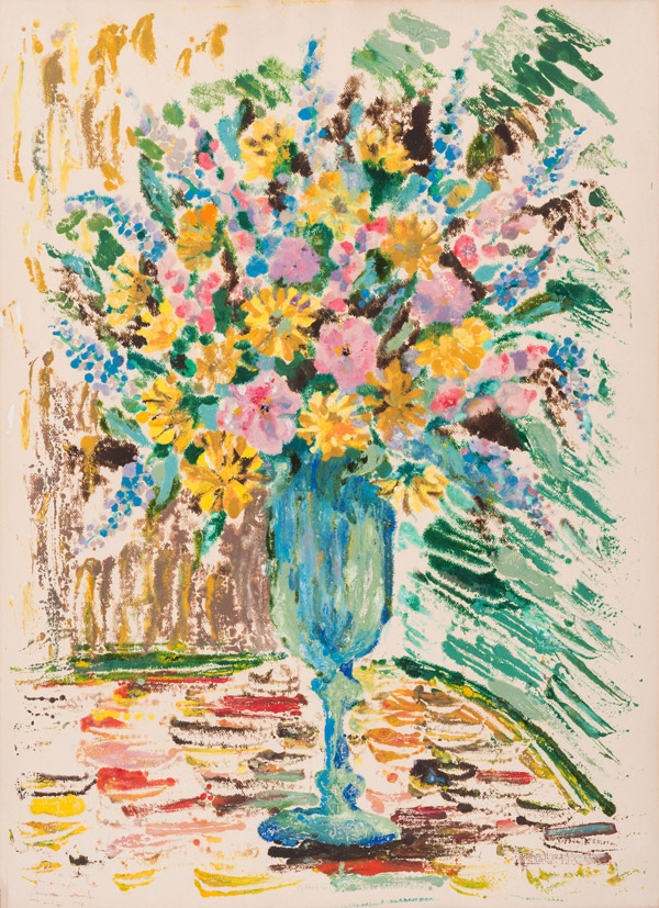 هرچند موضوع نقاشی حاضر، یک امر روزمره و تکراری از محیط زندگی است، اما نوع پرداخت به موضوع نشانگر تجربیات هنرمند از تحصیل در رشتههای هنری مختلف در ایران و اروپاست. نقاش با انتخاب آگاهانه متریال آبرنگ، لطافت گلها و شفافیت گلدان شیشهای را به خوبی بازنمایی کرده است. با این حال نوع این بازنمایی به واسطه ضرباهنگ جسورانه قلممو، به خوبی از پرداخت واقعنما فاصله گرفته و با بهرهگیری از تجربیات امپرسیونیستها و اکسپرسیونیستها، تجربه حسی هنرمند را صریح، سریع و بیواسطه بر بستر کاغذ ثبت میکند. ضربهقلمهای پرتحرک، اثر را از حالت ساکن خارج کرده و صحنه نقاشی را به عرصهای پویا و پرتحرک بدل میکند. این پویایی به واسطه خط کنارهنمای میز که با قوسی دیوار را از زمینه جدا میکند. تشدید شده و تمامی عناصر نقاشی را به هم ارتباط میدهد.