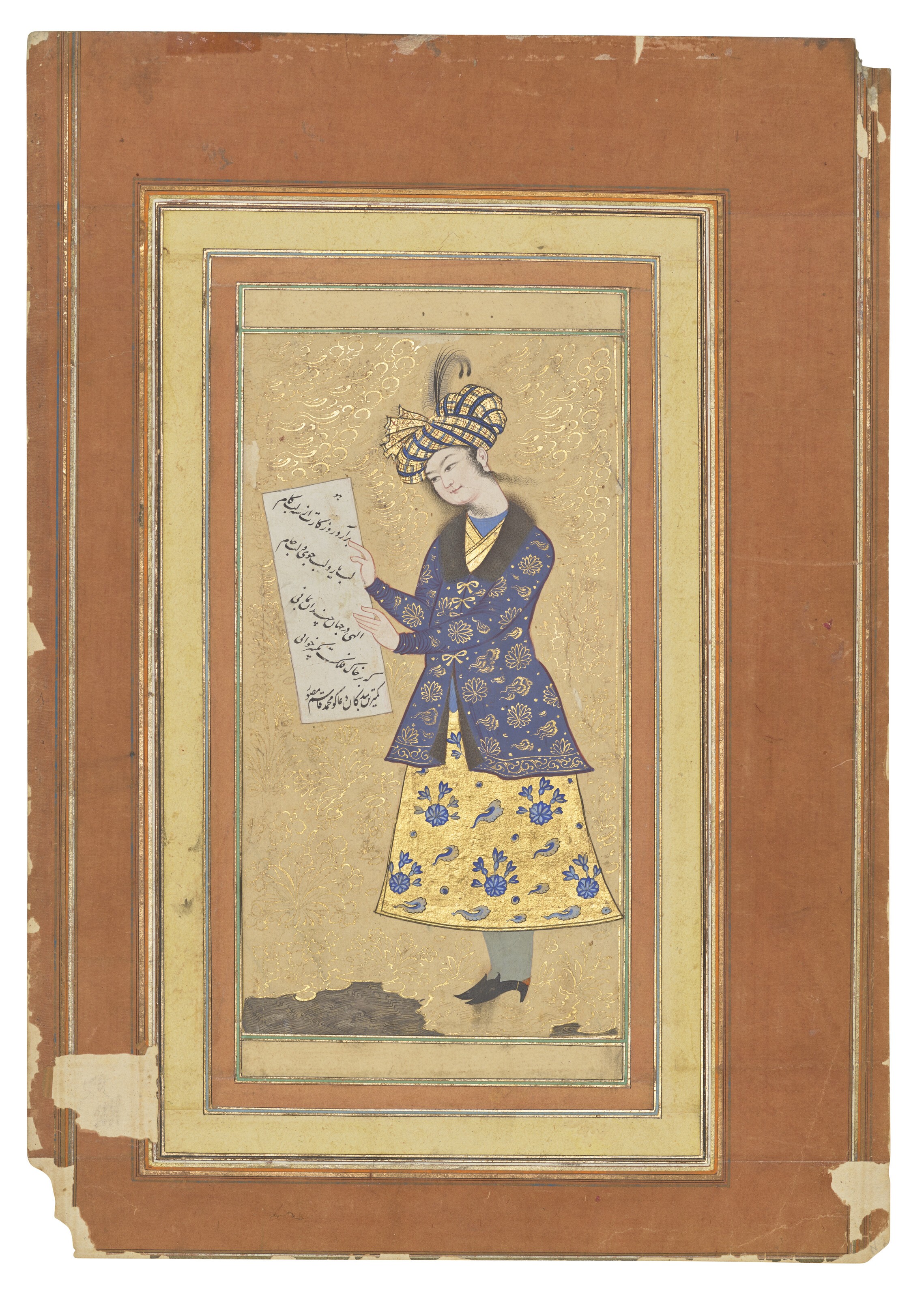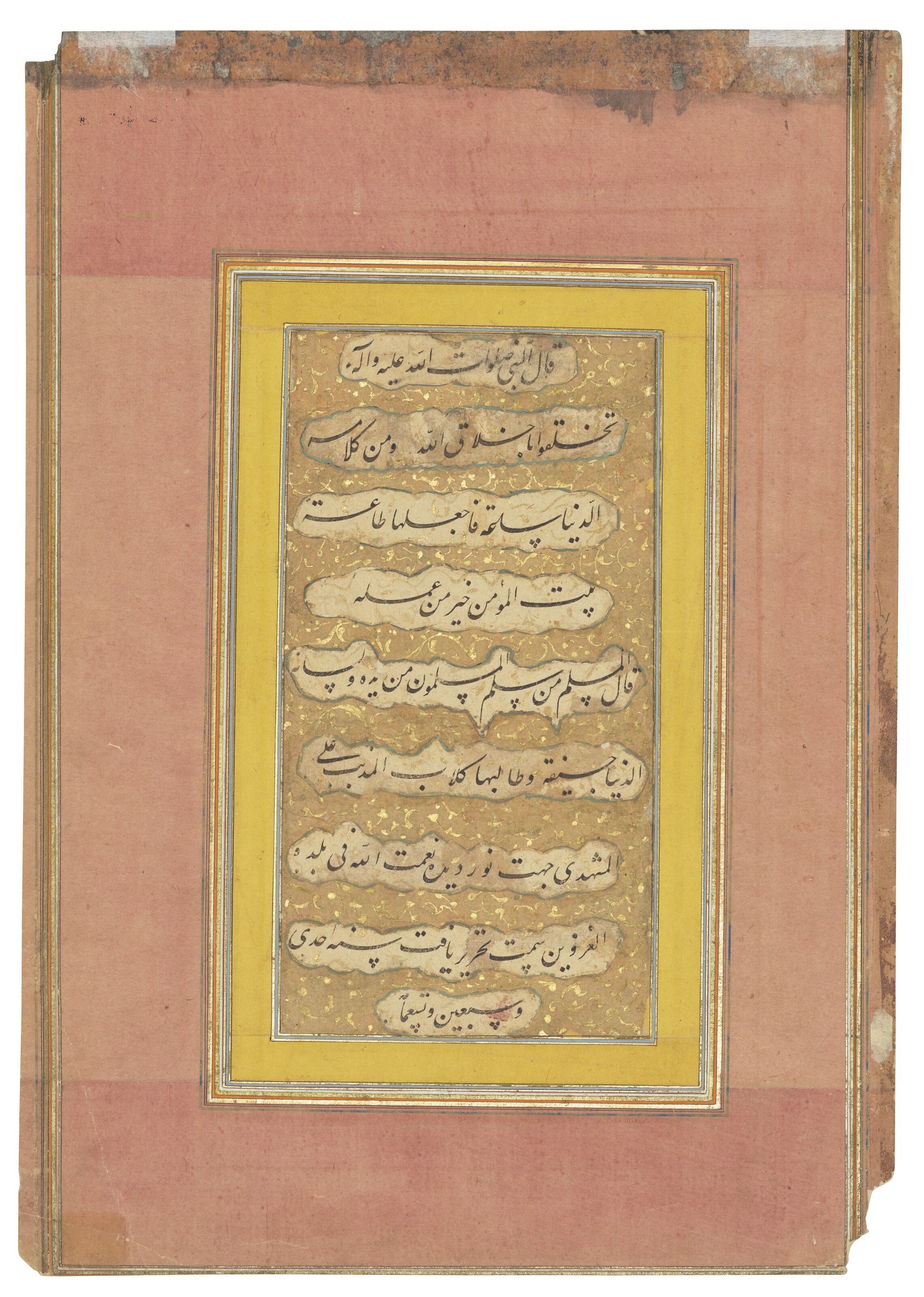 جوهر و رنگدانههای مات با طلا روی کاغذ نقاشی (۱۹.۱*۱۰.۴ سانتیمتر) امضاشده توسط محمد قاسم (حدود 0989-1008) خطاطی پشت اثر (۱۸.۸*۹.۹ سانتیمتر) امضاشده توسط علی المشهدی، نوشته شده برای نورالدین نعمتالله (مورخ 0942-0943) پیشینه: ای. بگیان (۱۸۷۷-۱۹۶۲)، لندن، قبل از ۱۹۳۱ هاگوپ کورکیان، نیویورک، قبل از ۱۹۴۰ ساتبیز لندن، نسخههای خطی و مینیاتورهای بسیار مهم شرقی، دارایی بنیاد کورکیان، ۱ دسامبر ۱۹۶۹، اثر شماره ۸۴
