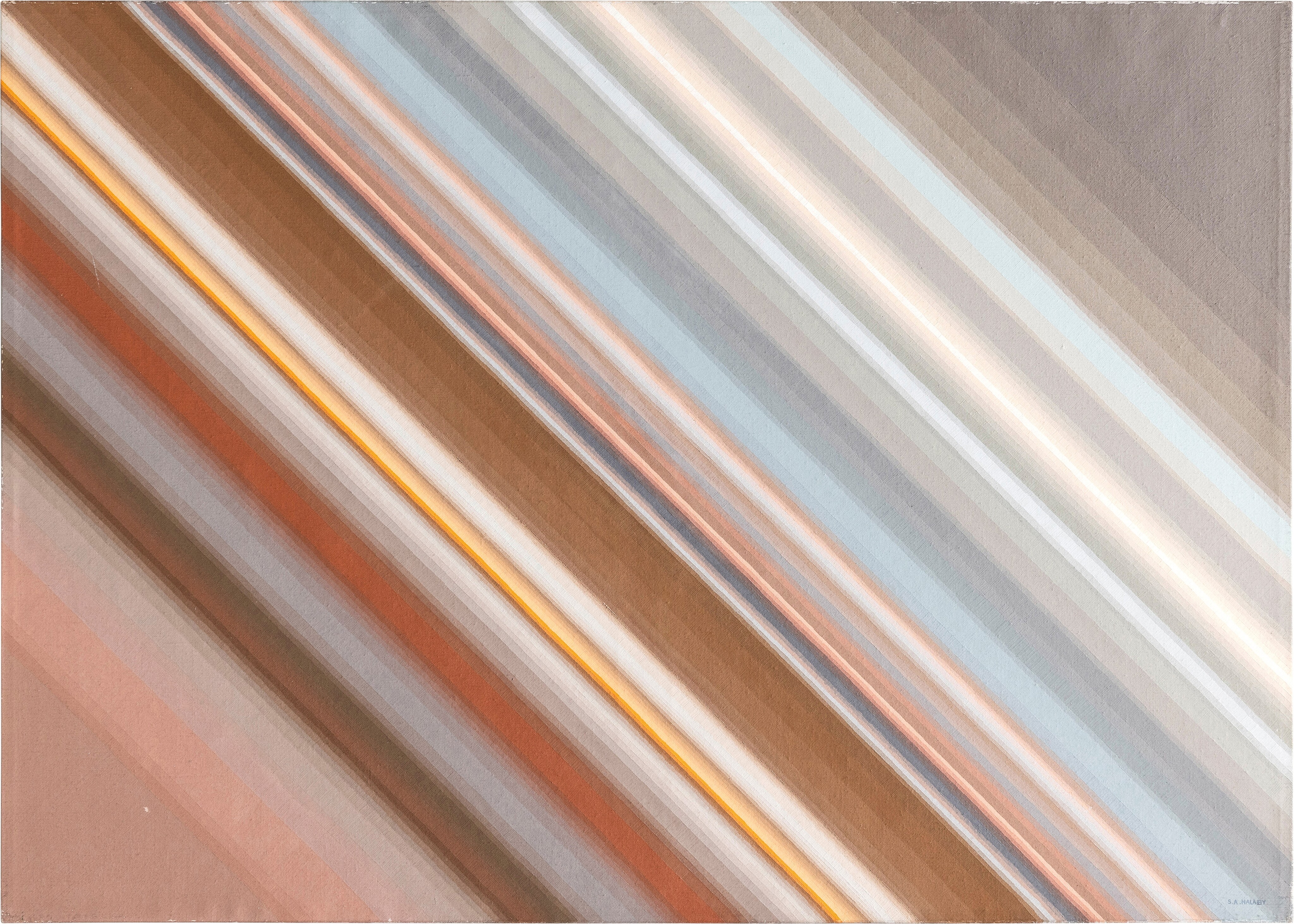 امضاشده «S. A. Halaby» به انگلیسی (پایین راست)؛ امضاشده «S. Halaby» و «Samia Halaby» به انگلیسی و عربی و تاریخخورده و شمارهخورده «1976، No. 290» به انگلیسی (پشت اثر)