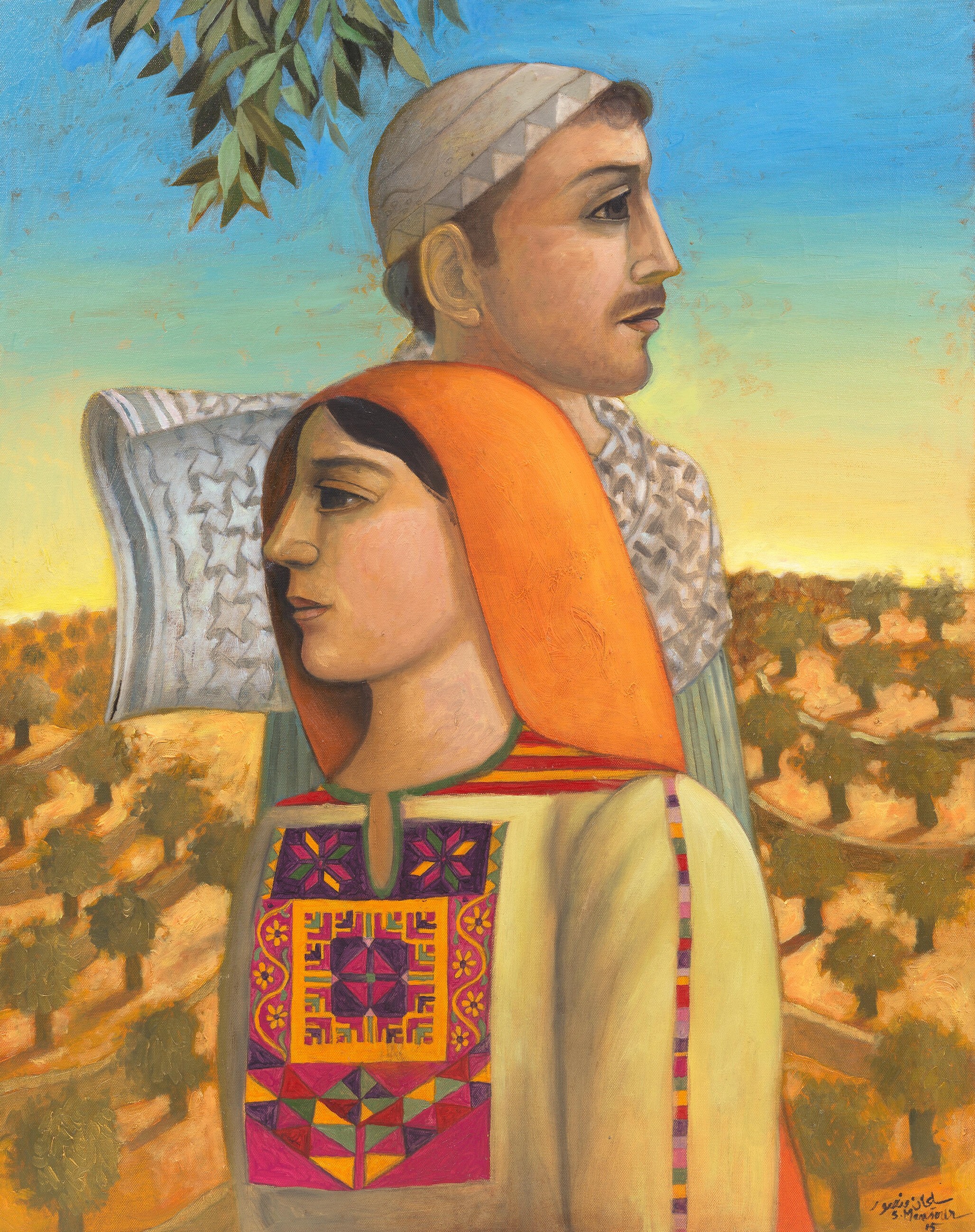 • امضاشده «Sliman Mansour» به عربی و انگلیسی و تاریخ‌خورده «۲۰۱۵» (پایین راست)